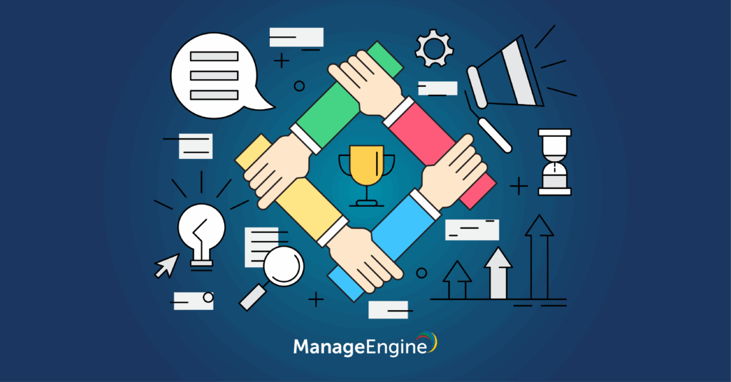 Zamień grupy na systemy, Współpraca między nimi dostarczy wielu korzyści, podnosząc jakość świadczonych usług. ManageEngine oferuje kompleksowy pakiet produktów do zarządzania IT, obejmujący wszystko od ITSM, przez UEM, IT Security, aż po ITOM. Jeśli zdecydujesz się na jednoczesne wdrożenie wielu produktów ManageEngine, zyskujesz nie tylko na wydajności i lepszej współpracy, ale również zautomatyzowanych i zoptymalizowanych procesach IT.