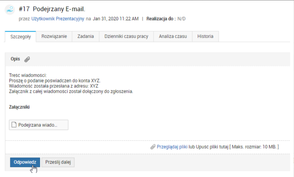 W samym zgłoszeniu, zarówno zgłaszający jak i serwisant, mogą kontaktować się przy użyciu domyślnych funkcji. Cała korespondencja będzie zapisywana w zgłoszeniu.
