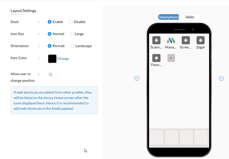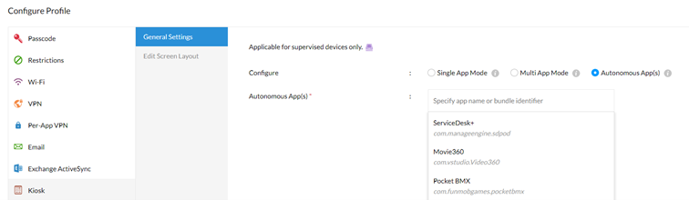 W trybie kiosk użytkownik otrzymuje dostęp do konkretnych aplikacji. W ostatnich wersjach Mobile Device Manager Plus istnieje możliwość skonfigurowania konkretnego układu oraz innych wizualnych kwestii związanych ze wspomnianą funkcjonalnością. Zmian można dokonywać zarówno na urządzeniach pracujących pod kontrolą systemu Android, jak i iOS.