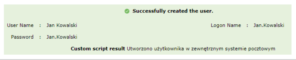 Po stronie systemu dostaniemy również informację o pomyślnym utworzeniu skrzynki pocztowej, w zewnętrznym systemie,