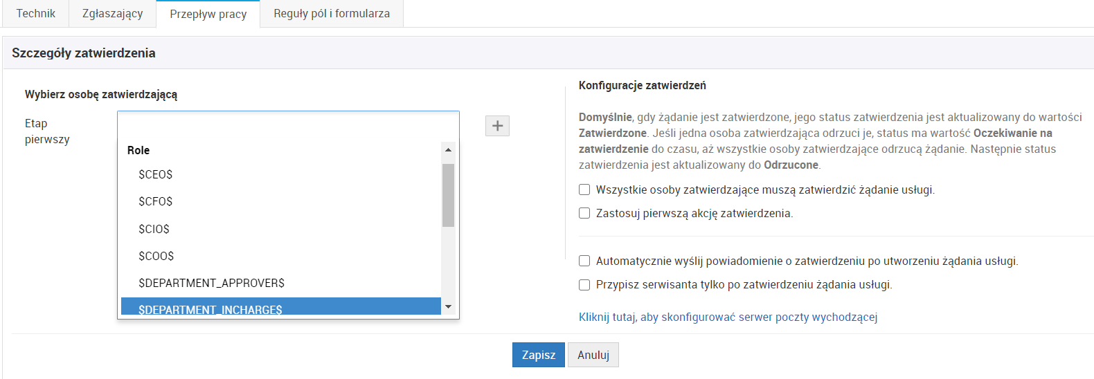 Dodatkową opcją jest możliwość wyboru osób zatwierdzających bezpośrednio w szablonie, gdzie możemy wskazać odpowiednie osoby przez zmienne, natomiast samych etapów akceptacji może być kilka.