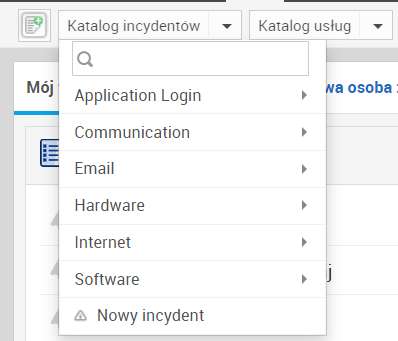 Na powyższym przykładzie możemy zauważyć, że ikony przy incydentach oraz wnioskach o usługę różnią się, co pozwala przy większej ilości szablonów intuicyjnie odróżnić jedno od drugiego. Oczywiście, jeśli ktoś woli bardziej „sztywny” podział możemy rozdzielić katalog zgłoszeń na katalog incydentów oraz katalog usług.