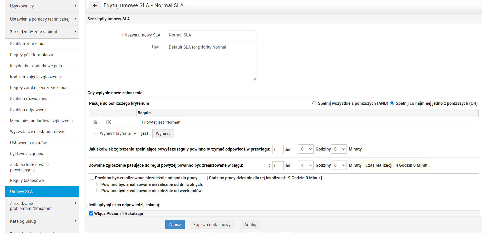 Konfiguracja umów SLA w przypadku incydentów wiąże się z ustaleniem pewnych stałych reguł, które będą odnosić się do wszystkich zgłoszeń (z bloku incydentów). Ustalamy, że np. w momencie utworzenia zgłoszenia o priorytecie normalnym „przypina” się umowa SLA o czasie realizacji 4 godziny.