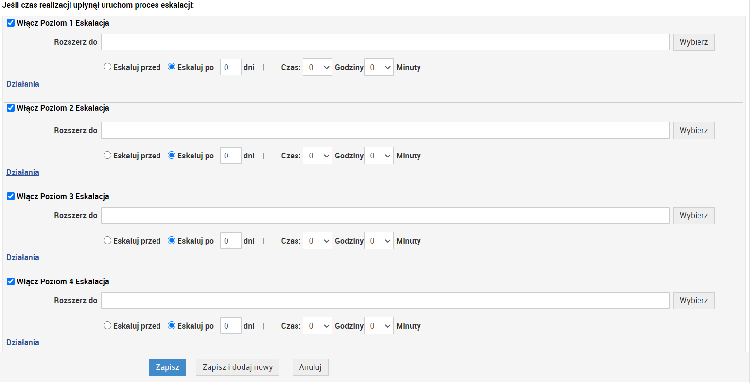Możemy oczywiście ustawić więcej warunków, które muszą zostać spełnione, żeby przypisać tą konkretną umowę. Do naszej dyspozycji pozostaje również możliwość zdefiniowania eskalacji do właściwego serwisanta lub zgłaszającego w przypadku przekroczenia czasów zdefiniowanych w umowie. Eskalacja może dotyczyć zarówno przekroczenia czasu pierwszej odpowiedzi do zgłaszającego, jak i opóźnienia terminu realizacji. W tym przypadku mamy do dyspozycji aż 4 poziomy intensyfkacji z możliwością zdefiniowania różnych czasów dla każdego etapu oraz wskazania innych osób, które mają zostać powiadomione.