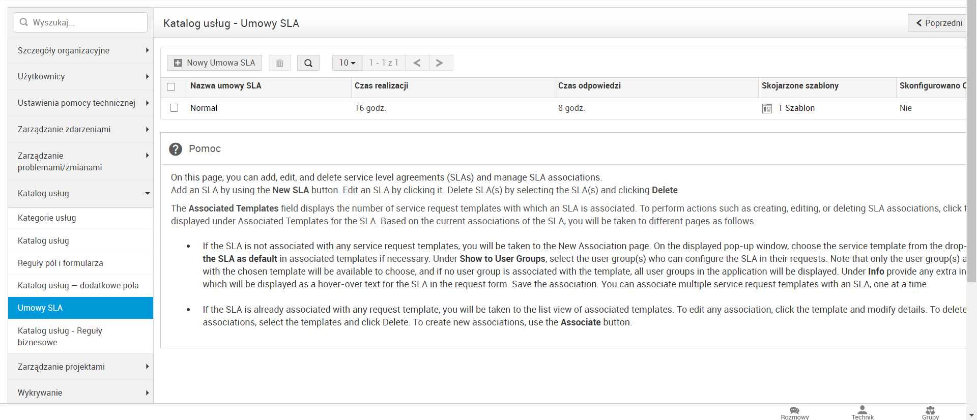 Sytuacja wygląda zupełnie inaczej w przypadku wniosków o usługę, gdzie możemy zdefiniować wszystkie umowy SLA w jednym miejscu, ale są one w 100% niezależne od umów SLA incydentów i są przypisywane na stałe do konkretnych szablonów.