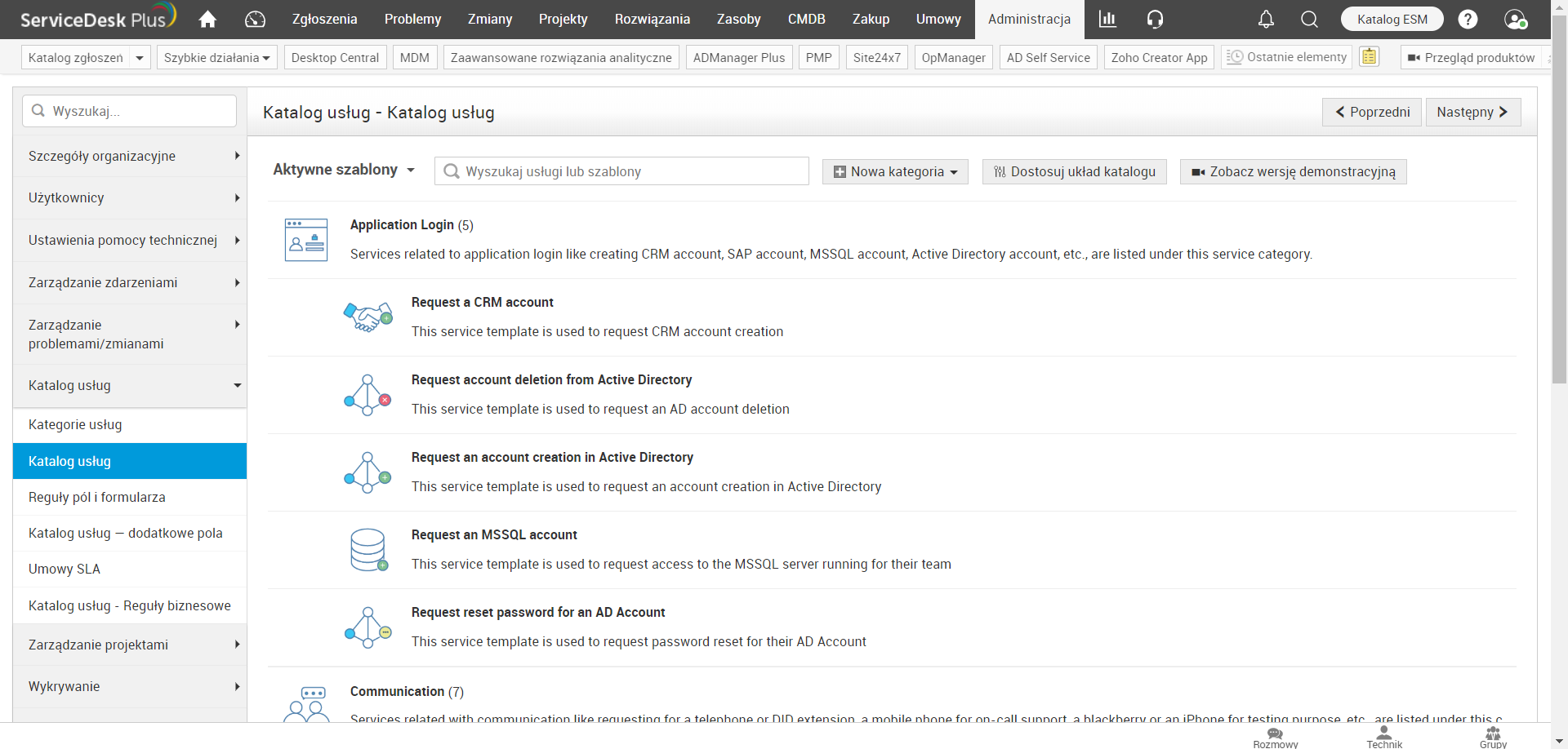 Kluczowym hasłem w kontekście wniosków o usługę jest katalog usług. To dzięki niemu możemy tworzyć kategorie, do których następnie przydzielamy odpowiednie szablony.