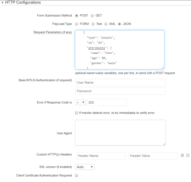 System pozwala nam również na wykonanie prostej autentykacji NTLM’owej, dodania własnych nagłówków HTTP oraz wymuszenia specyficznego User Agent’a. Dzięki temu mamy możliwość monitorowania wymaganego API do poprawnego działania naszej usługi kluczowej.