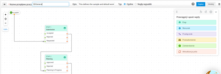 Modyfikacji uległ również wizualny sposób konfigurowania workflow zmian po przejściu do Administracja -> Zarządzanie problemami/zmianami -> Zmień przebieg pracy. Edytor umożliwia między innymi konfigurację kolejnych etapów, warunków, powiadomień czy akceptacji.