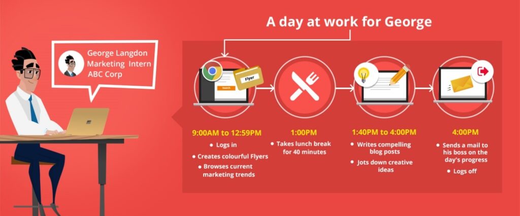 Powyższa ilustracja przedstawia typowy dzień pracy George’a Langdona, który pracuje jako stażysta ds. marketingu w ABC Corp. Gdy wystąpi jakieś odchylenie od oczekiwanego zachowania, wynik ryzyka wzrośnie. Załóżmy, że system George’a jest nadal aktywny po 16:00. Choć może to być osoba, która uzyskała nielegalny dostęp do komputera George’a, nie można wykluczyć możliwości, że George będzie pracował dłużej, aby dokończyć swoją pracę. Jeśli to ostatnie jest powodem uzyskania dostępu do systemu w mało prawdopodobnej godzinie, zwiększenie wyniku ryzyka służy jako fałszywy alarm.